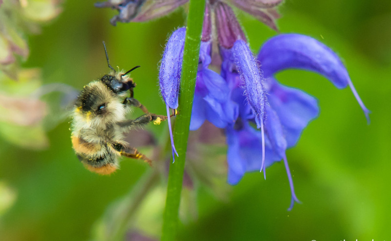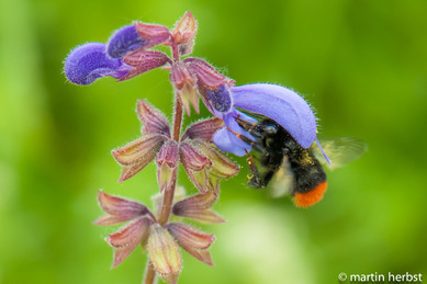Die oben abgebildete Bunt- oder Waldhummel ist im Anflug auf eine Blüte des Wiesensalbeis. Diese Art steht auf der Roten Liste der vom Aussterben bedrohten Tiere. Leider ist sie aus manchen Regionen schon verschwunden. Wir werden durch die Pflege der Salbeiwiese im Garten der Grünspechte einen Beitrag dazu leisten, dass sie uns noch möglichst lange erhalten bleibt.